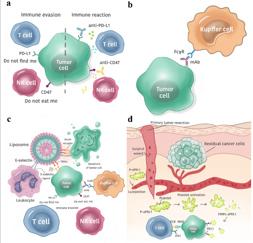 สี่กลยุทธ์ภูมิคุ้มกันบำบัดที่มุ่งเป้าที่เซลล์มะเร็งในกระแสเลือด (CTCs) ได้แก่ (a) การบล็อก immune checkpoint คู่ PD-L1/CD47 (b) การใช้ monoclonal antibody กระตุ้น Kupffer cell ในตับ (c) การใช้เม็ดเลือดขาวเป็นพาหนะส่ง TRAIL เข้าโจมตี CTC และ (d) การใช้เกล็ดเลือดส่ง anti-PD-L1 ไปยังบาดแผลหลังผ่าตัดเพื่อป้องกันการกลับมาของโรค
